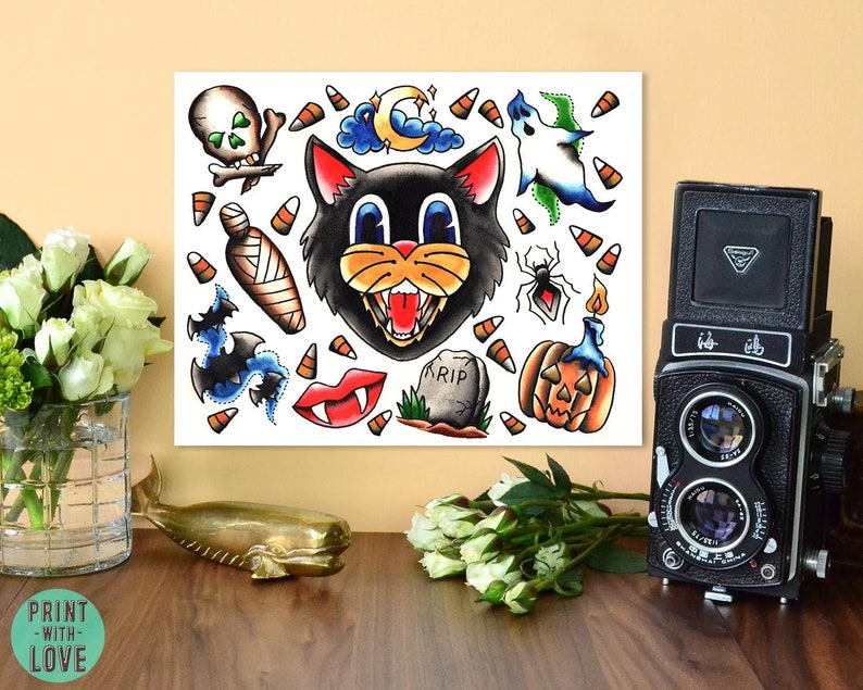 Halloween Tattoo Flash American Neo Traditional Vintage Tattoo Art Spooky Pumpkin Autumn Candy Corn Cat Watercolor Print