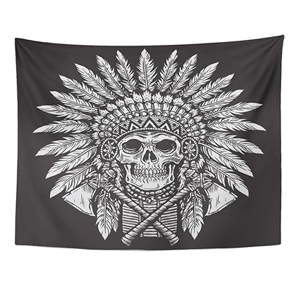 Emvency Tapestry Indian Bold Native American Skull Chief Cherokee Plume Tattoo Home Decor Wall Hanging For Living Room Bedroom Dorm 60x80 Inches