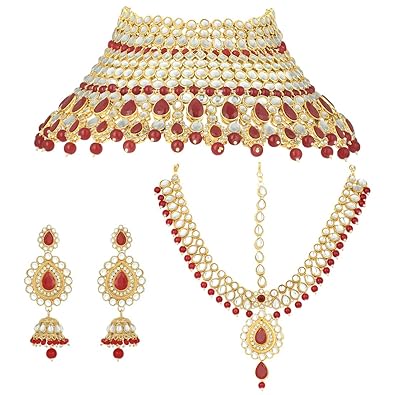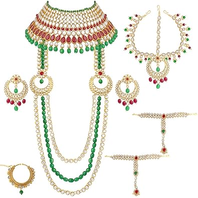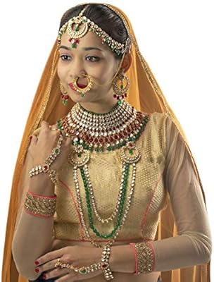 If you want some refreshing ideas for your wedding day start following our pinterest boardif you need a personalized session we offer complimentary one on one in store consultations. Aheli indian bridal jewelry set faux kundan long choker necklace dangle earrings mathapatti headpiece haath phool with nose ring red green 6599 65.