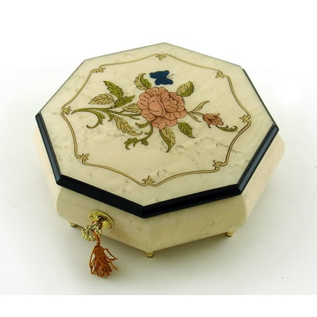 Immaculate 30 Note Ivory Stain Octagonal Music Jewelry Box With Rose And Butterfly Inlay I Ll Make Love To You