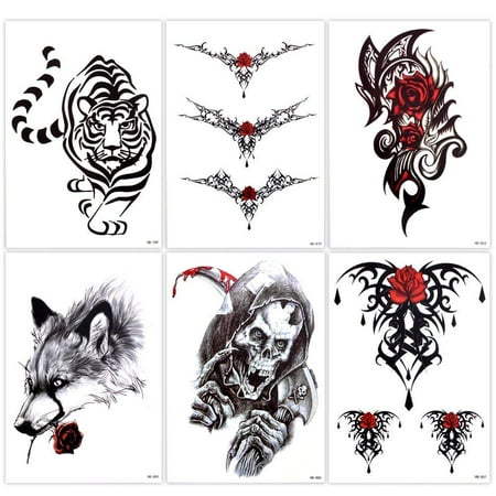 Lady Up 6 Sheets Temp Body Art Temporary Tattoos Fake Tattoo For Women Men Kid Skull Flower Tiger Wolf Waterproof Stickers